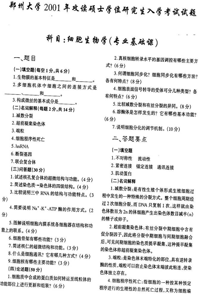 2001年郑州大学《细胞生物学》考研真题(含部分答案)