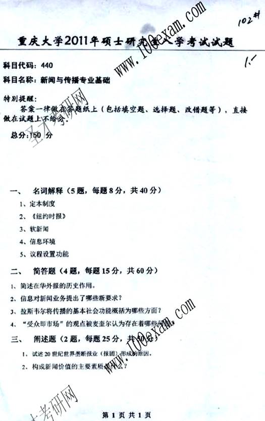 2011年重庆大学《440新闻与传播专业基础》考研真题