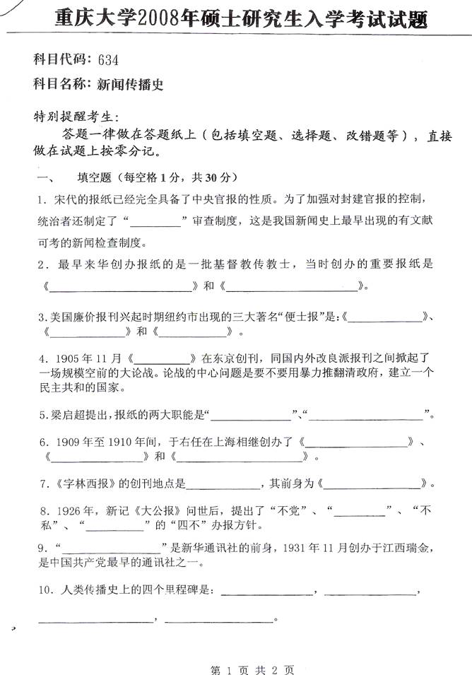 1. 重庆大学新闻学院《634新闻传播史论》历年考研真题汇总(含部分答案)