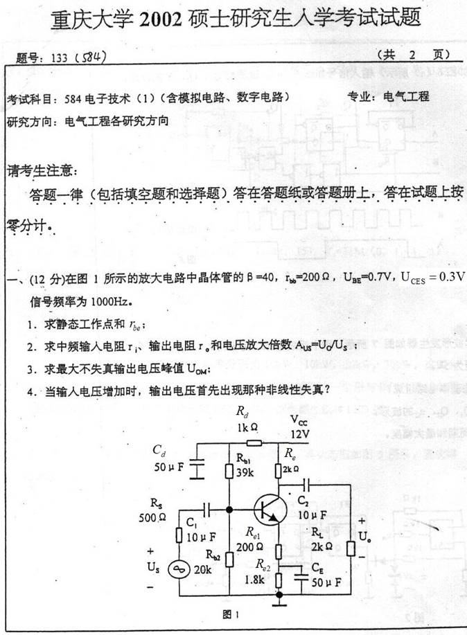 2002年重庆大学584电子技术(1)(含模拟电路、数字电路)考研真题