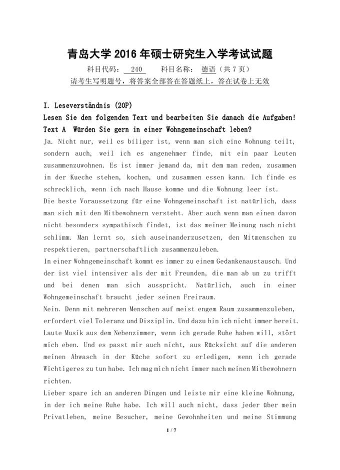 2016年青岛大学240德语考研真题