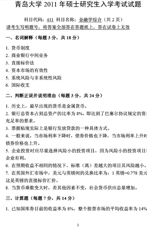 1. 青岛大学经济学院《431金融学综合》[专业硕士]历年考研真题汇总(含部分答案)