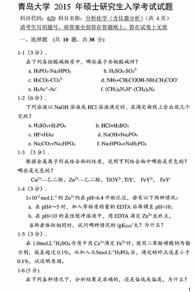 2015年青岛大学620分析化学(含仪器分析)考研真题(部分)