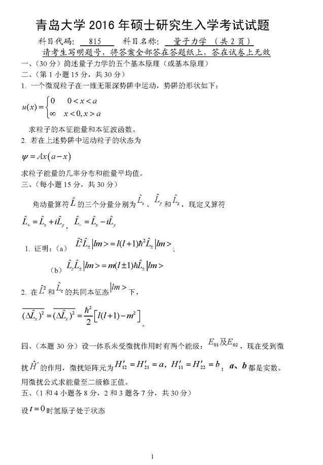 1. 青岛大学物理科学学院《815量子力学》历年考研真题汇总