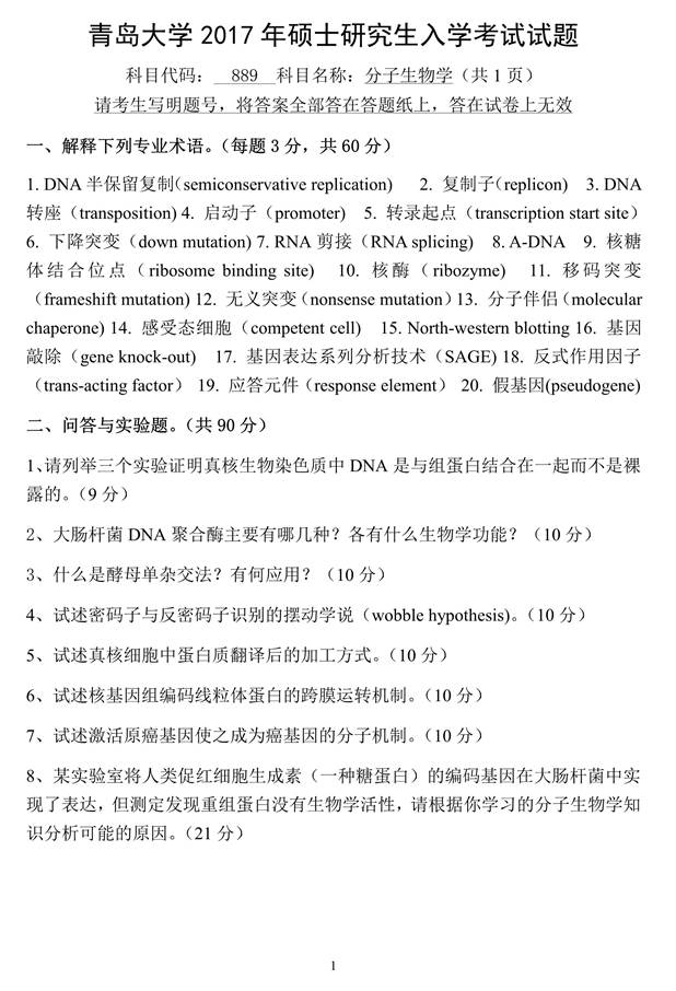 2017年青岛大学889分子生物学[专业硕士]考研真题