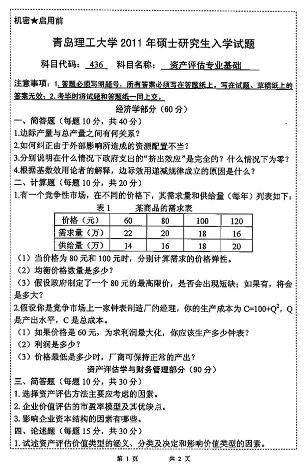 2011年青岛理工大学《436资产评估专业基础》考研真题