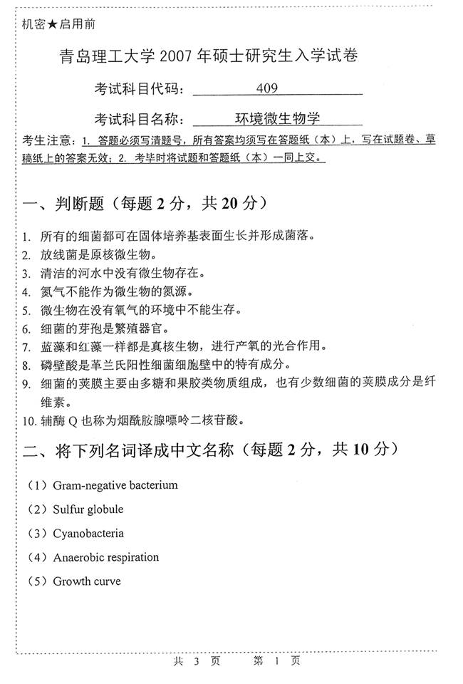 1. 青岛理工大学环境与市政工程学院《809环境微生物学》历年考研真题汇总