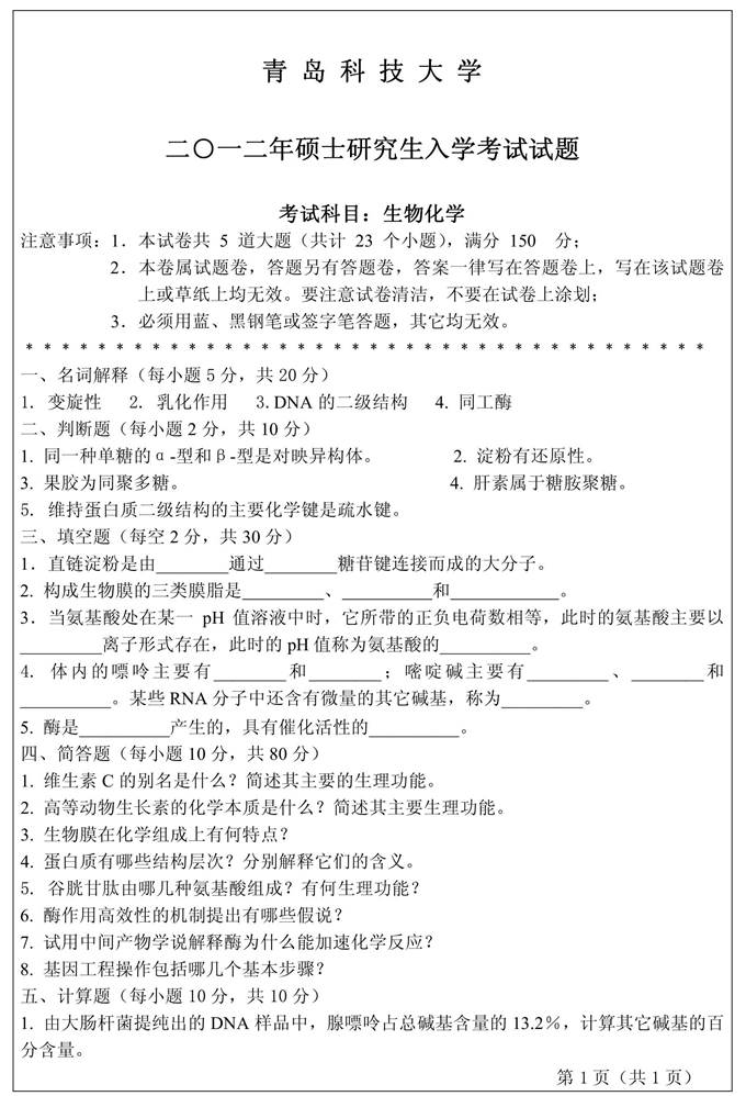 2012年青岛科技大学836生物化学考研真题