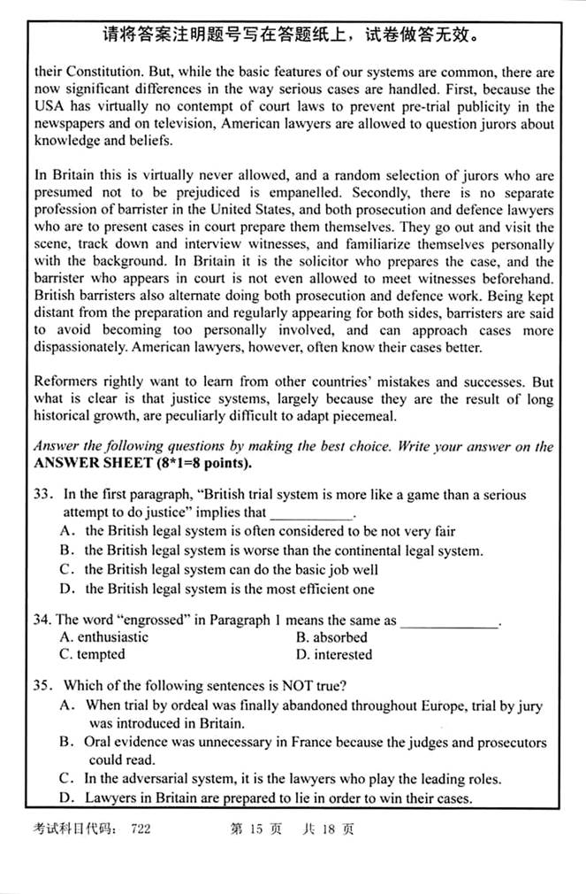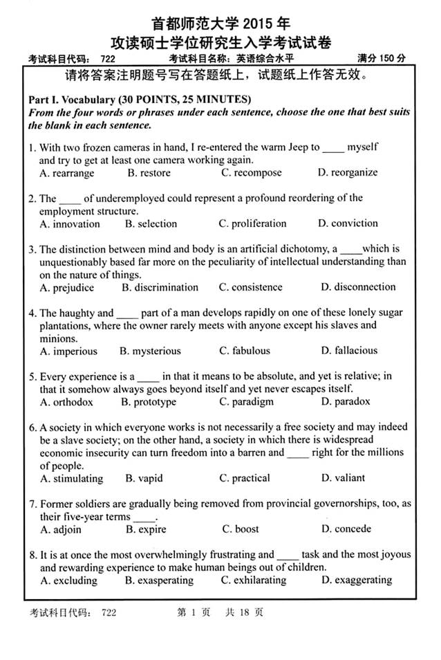2015年首都师范大学722英语综合水平(词汇、语法、阅读、翻译、写作等)考研真题