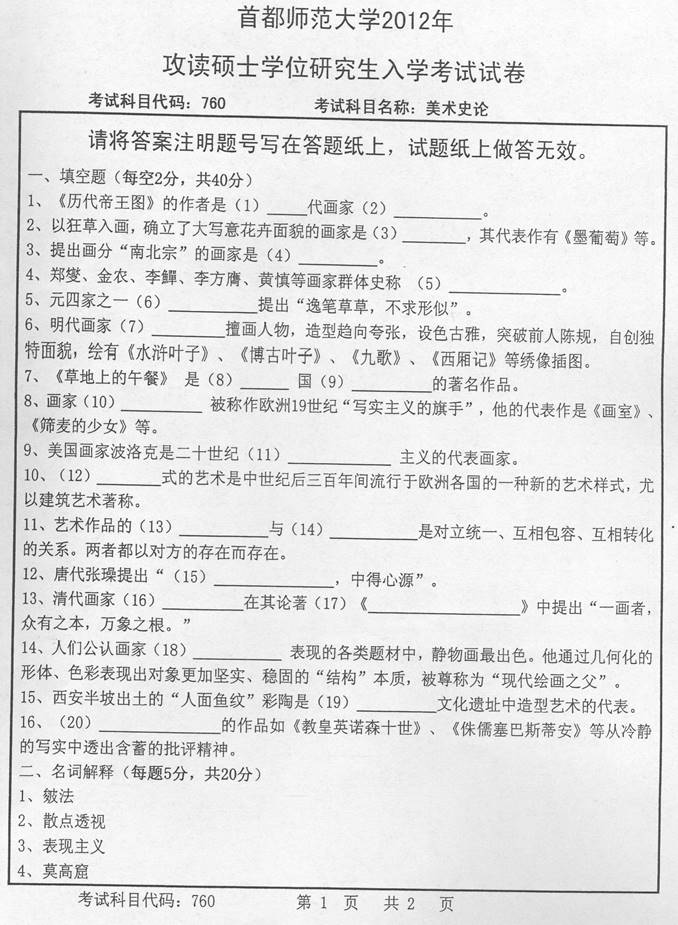 2012年首都师范大学美术学院《760美术史论》考研真题