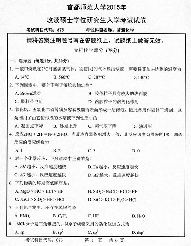 2015年首都师范大学875普通化学[专业硕士]考研真题