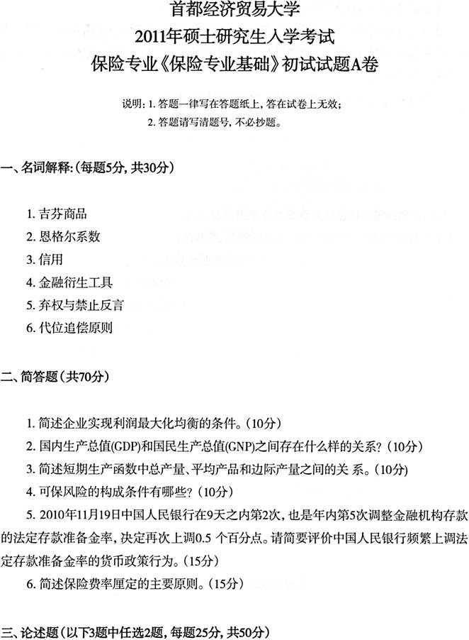 第二部分 首都经济贸易大学金融学院保险硕士历年考研复试真题