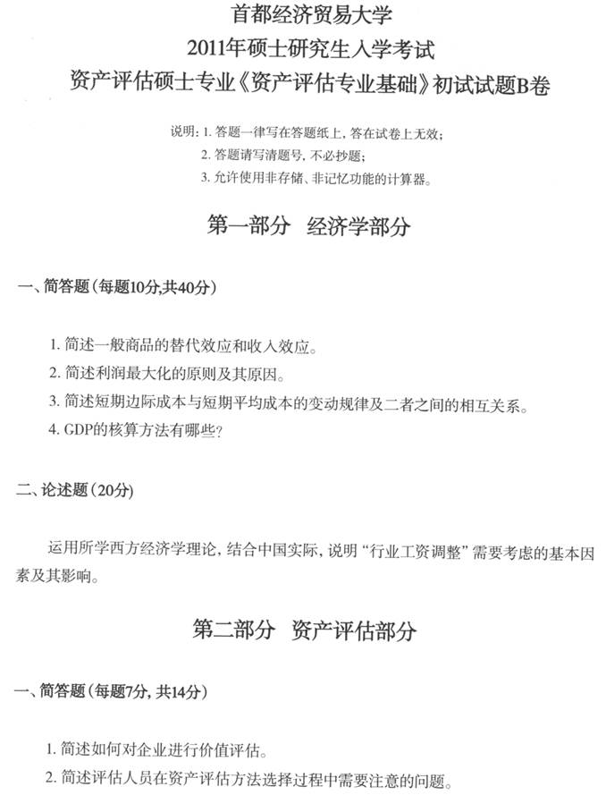 2011年首都经济贸易大学436资产评估专业基础[专业硕士]考研真题及详解