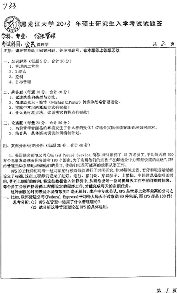 1. 黑龙江大学政府管理学院《733公共管理学》历年考研真题汇总